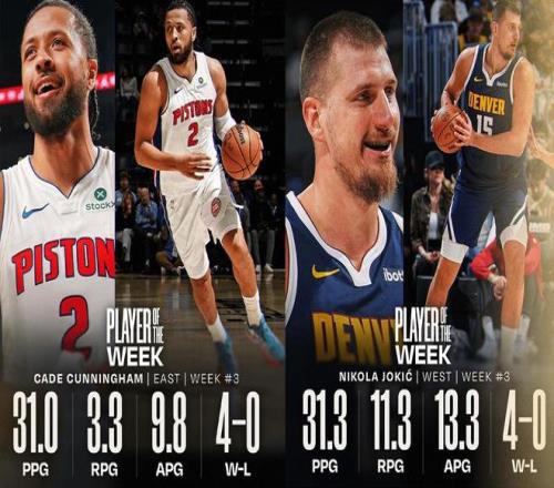 在这轮比赛之前,NBA官方公布了上周的周最佳球员,坎宁安和约基奇分别当选。其中,坎宁安上周率球队取得了4胜0负,场均可以得到31分3.3篮板9.8助攻。约基奇上周率球队取得了4胜0负,场均可以得到31.3分11.3篮板13.3助攻。坎宁安这赛季进化还是很明显的,打得是更有自信了,对抗提升的同时,在场上失误数减少,关键时刻打得往往特别强硬。而约基奇,不愧联盟现役即战力第一人啊,划划水就能拿到场均三双,得分、篮板、助攻一把抓;本赛季,约老师估计又要和亚历山大,字母哥他们竞争MVP了。